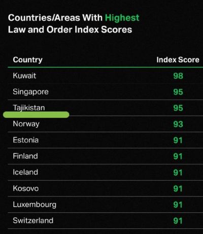 Таджикистан и Сингапур, набравшие 95 баллов в мировом рейтинге безопасности, размещены после Государства Кувейт.
