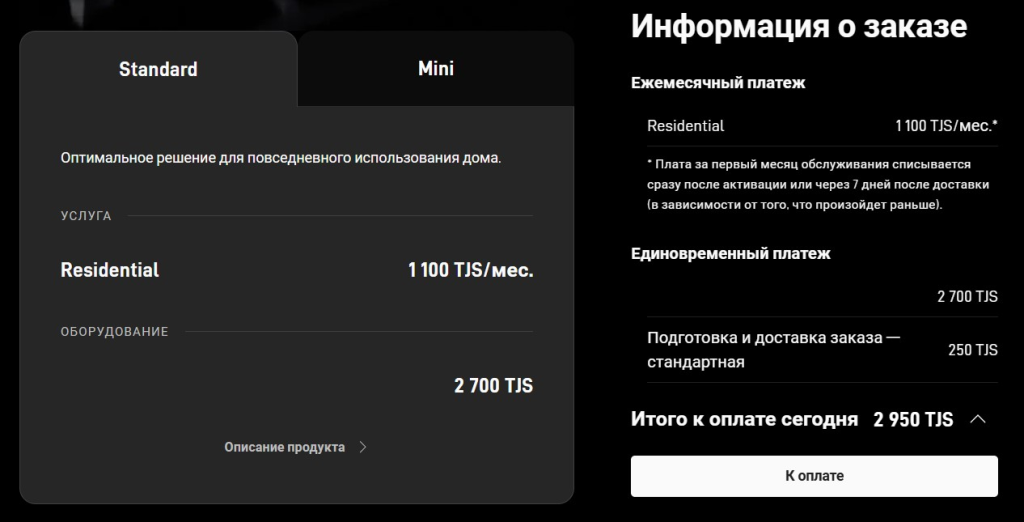 Ежемесячная плата списывается автоматически с привязанного способа оплаты. В стоимость включен доступ в интернет без разделения на внутренний и внешний трафик. Дополнительные платежи возможны только при смене тарифного плана, активации мобильных опций (Roam) или замене оборудования вне гарантийного случая. Однако в настоящий момент для тарифа Roam в Таджикистане тоже указывается 1100 сомони в месяц.