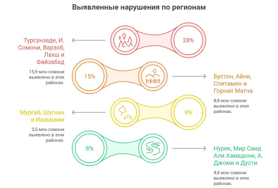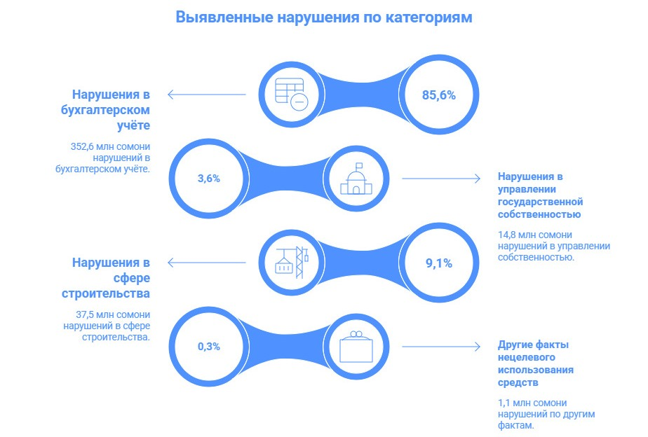 Также проверке подверглись 46 государственных хозяйствующих субъектов, где выявлены нарушения финансовой дисциплины на сумму 240,7 млн сомони, из которых 150 млн сомони уже восстановлены.