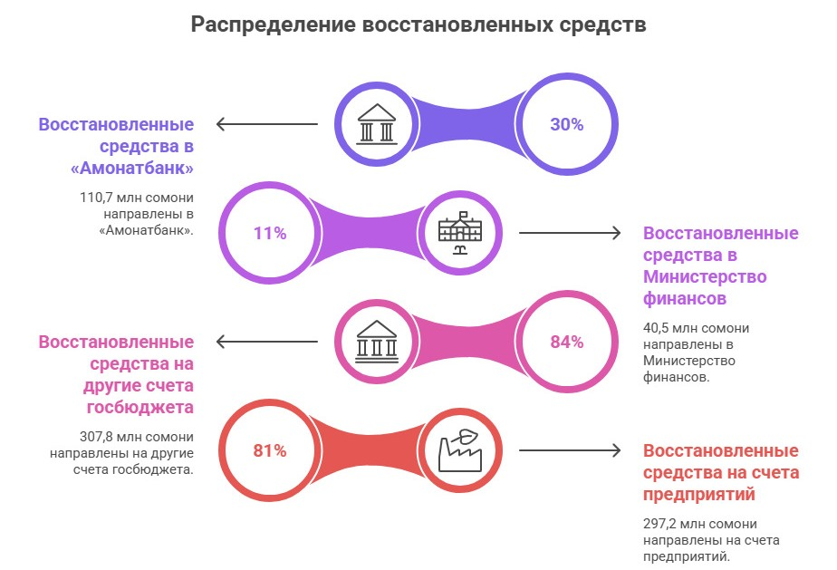 По словам главы Счётной палаты, восстановлено 756,2 млн сомони, что составляет 67,7% от общей суммы выявленных нарушений, в том числе: