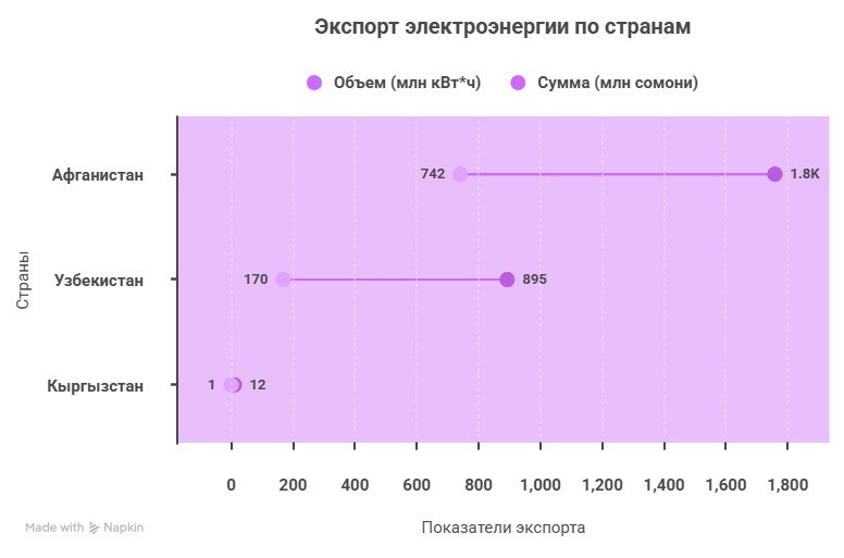 В частности, коммерческий экспорт электроэнергии в три страны составил 2 млрд 666,4 млн кВт*ч на сумму 912,8 млн сомони (около 100 млн долларов).