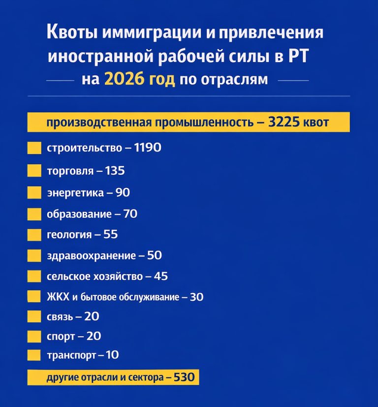 Указом поручается установить квоту иммиграции и привлечения иностранной рабочей силы в республику на 2026 год в количестве 5500 человек. Это на 500 человек меньше по сравнению с аналогичными квотами, которые были установлены в 2025 году.