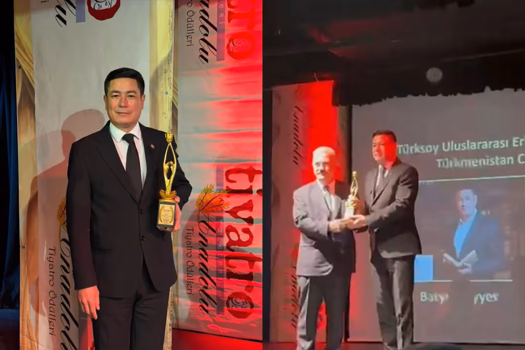 Артист Главного академического драматического театра имени Сапармурата Туркменбаши, заслуженный артист Туркменистана Батыр Чарыев был награжден памятной статуэткой за вклад в театральное искусство тюркского мира в номинации «Лучший актер».