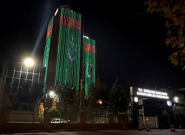 Здания Союза торгово-промышленных палат и бирж Турции – самые высокие здания Анкары – 27 сентября окрасились в цвета национального туркменского флага.