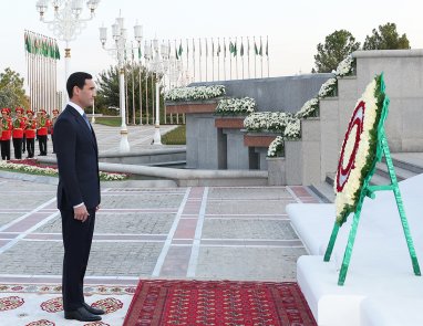 Церемония началась с исполнения государственного гимна Туркменистана военным оркестром. Президент возложил венок к монументу, который является символом свободы и суверенитета страны. Вслед за главой государства букеты цветов возложили другие участники церемонии.