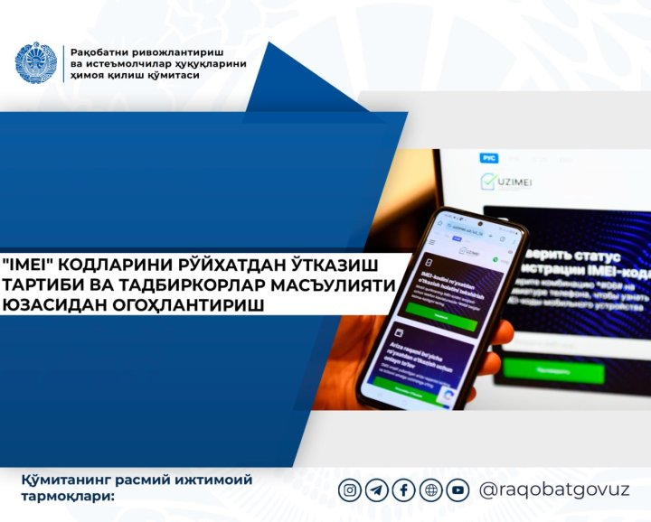 В связи с вышеизложенным Комитет напоминает, что в случае несоблюдения требований по регистрации IMEI-кодов хозяйствующими субъектами, производящими или импортирующими и продающими мобильные устройства на территории нашей республики, и нарушения прав потребителей, будут применяться штрафные санкции в установленном порядке.